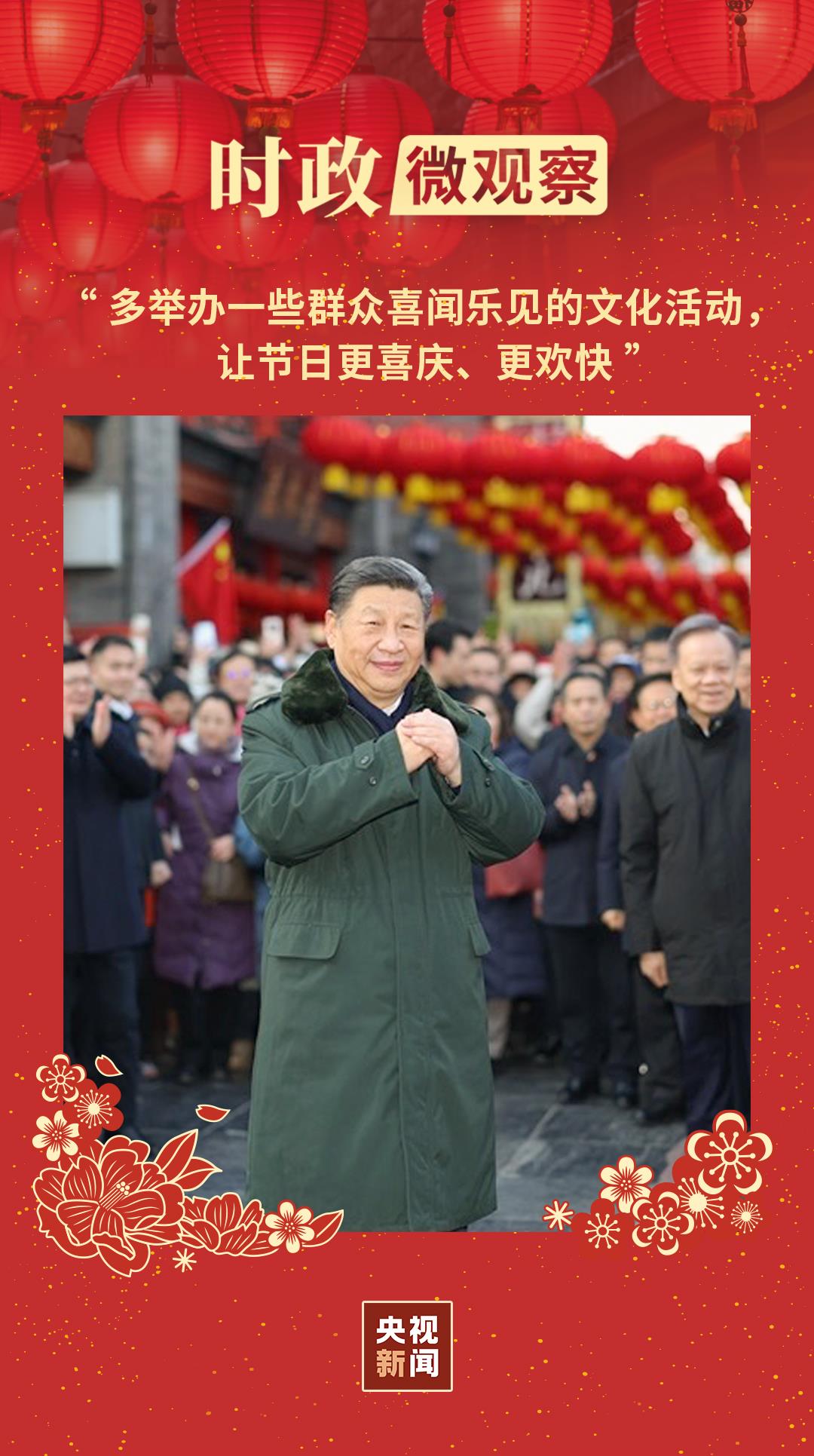 △2014年1月,農(nóng)歷馬年春節(jié)到來之際,習近平總書記來到內(nèi)蒙古,看望慰問各族干部群眾,向全國各族人民致以誠摯的新春祝福。 2020年1月,習近平總書記走進云南省騰沖市清水鎮(zhèn)三家村中寨司莫拉佤族村。在廣場上,村民們跳起了歡快的佤族舞蹈。按照當?shù)仫L俗,總書記敲響三聲佤族木鼓,祝福來年風調(diào)雨順、國泰民安。 “春節(jié)期間,各地可以多舉辦一些群眾喜聞樂見的文化活動,讓節(jié)日更喜慶、更歡快。”這次在天津考察時,習近平總書記特意叮囑。 有拉洋片、雜技相聲等傳統(tǒng)技藝展示,也有賣炸灌腸、糖葫蘆的小攤位……今年春節(jié)期間,北京全面恢復(fù)傳統(tǒng)廟會,激活了許多老北京的獨特春節(jié)記憶。 在浙江杭州,跨湖橋遺址博物館推出增強現(xiàn)實技術(shù)服務(wù),游客可以借此探尋八千年前此地先民的生活。 在陜西西安,陜菜文化體驗博物館嘗試把漢賦唐詩中描寫的古代菜肴復(fù)原出來,讓客人領(lǐng)略傳統(tǒng)美食的“文韻”…… 傳承著中華優(yōu)秀傳統(tǒng)文化的基因,春節(jié)的文化味道從歷史深處走來,弦歌不絕、生生不息。 年味里有共祝美好的溫情 “感人心者,莫先乎情。” 習近平總書記曾深情說道:“當今社會快速變化,人們?yōu)楣ぷ鲝U寢忘食,為生計奔走四方,但不能忘了人間真情,不要在遙遠的距離中割斷了真情,不要在日常的忙碌中遺忘了真情,不要在日夜的拼搏中忽略了真情。” 春節(jié)文化的醇厚綿長,為奔跑中的逐夢人提供了心靈棲居之所。中國年的到來,也把每一位中國人更加緊密地聯(lián)系在一起。 兩個多月前,在上海閔行區(qū)新時代城市建設(shè)者管理者之家考察時,習近平總書記悉心囑托,“城市不僅要有高度,更要有溫度”。 這幾天,城市建設(shè)者管理者之家暖意融融。在共享廚房里,住戶張女士將熱氣騰騰的餃子端上桌。來自五湖四海、在各行各業(yè)的城市奮斗者們圍坐一起吃餃子、拉家常。
