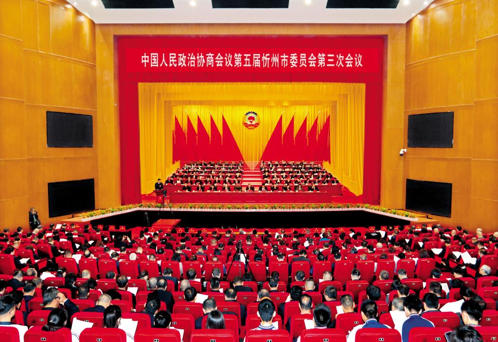 大會(huì)會(huì)場(chǎng)。范濤 攝 本報(bào)訊 (記者魏鵬飛)凝心聚力共奮進(jìn),砥礪前行譜新篇。3月26日上午,政協(xié)第五屆忻州市委員會(huì)第三次會(huì)議隆重開(kāi)幕。來(lái)自全市各界的政協(xié)委員齊聚一堂,積極履行政治協(xié)商、民主監(jiān)督、參政議政職能,合力推動(dòng)忻州在高質(zhì)量發(fā)展上不斷取得新突破,為續(xù)寫(xiě)忻州踐行新時(shí)代中國(guó)特色社會(huì)主義新篇章匯聚正能量、作出新貢獻(xiàn)。 忻州大劇院大劇場(chǎng)布置簡(jiǎn)樸,莊嚴(yán)隆重。會(huì)場(chǎng)內(nèi),燈光璀璨,氣氛熱烈。中國(guó)人民政治協(xié)商會(huì)議會(huì)徽懸掛在主席臺(tái)正中,十面鮮艷的紅旗分列兩側(cè)。會(huì)場(chǎng)后方高高懸掛著大紅條幅:以習(xí)近平新時(shí)代中國(guó)特色社會(huì)主義思想為指導(dǎo),推動(dòng)中國(guó)式現(xiàn)代化忻州實(shí)踐邁出堅(jiān)實(shí)步伐! 上午9時(shí),大會(huì)在雄壯的國(guó)歌聲中開(kāi)幕。