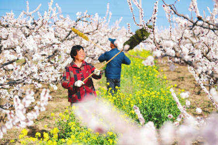 3月19日,永濟市韓陽鎮(zhèn)長旺村杏園里,杏農正在對杏花進行授粉作業(yè)。李向東攝