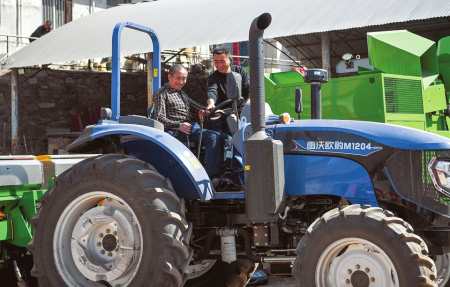 3月23日,臨汾市古縣舊縣鎮(zhèn)金紅農機市場內,農機手在銷售人員的指導下挑選拖拉機。閆銳鵬攝