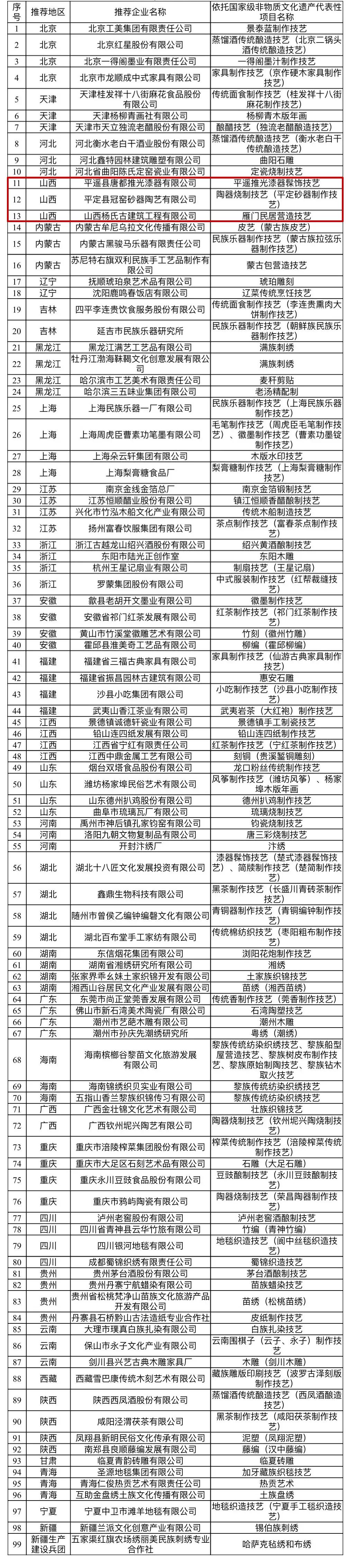 根據(jù)《“十四五”非物質(zhì)文化遺產(chǎn)保護(hù)規(guī)劃》和文化和旅游部等十部門《關(guān)于推動(dòng)傳統(tǒng)工藝高質(zhì)量傳承發(fā)展的通知》的工作要求,在各地推薦的基礎(chǔ)上,經(jīng)過專家評(píng)審、實(shí)地考察和社會(huì)公示等程序,文化和旅游部認(rèn)定99家企業(yè)和單位為“2023—2025年國(guó)家級(jí)非物質(zhì)文化遺產(chǎn)生產(chǎn)性保護(hù)示范基地”,現(xiàn)予公布。