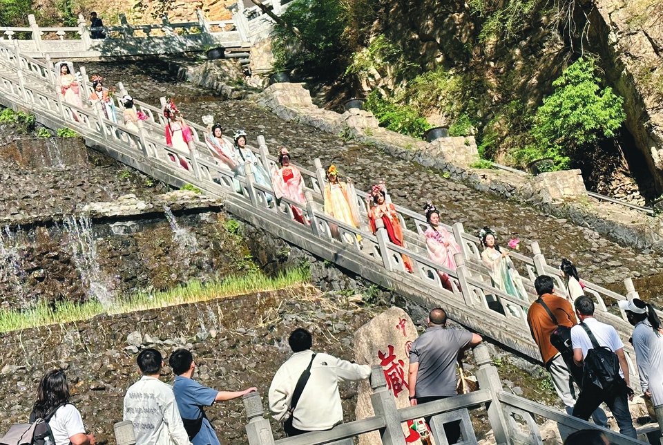 青綠山水間,身著漢服、烏發(fā)簪花、手持花枝的“小姐姐”隨風起舞,身姿曼妙……5月2日,藏山景區(qū)游人如織,“國風古意 邂逅陽泉”巡游活動成為景區(qū)一大亮點,圈粉眾多游客。