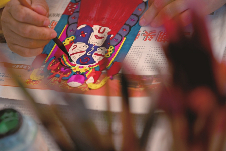 這么有趣的剪紙作品又是如何誕生的呢?走進該博物館剪紙制作車間,只見學員們手中的刻刀上下跳動,一件件精美的剪紙作品雛形便逐漸顯現(xiàn)?!耙患艏堊髌返闹谱鹘^對不是靠簡簡單單的一把剪刀、一張紅紙就可以完成的,它要經(jīng)歷設(shè)計、刀刻、顏染、裝裱4個大步驟38個小步驟?!辈┪镳^講解員曹慧中指著剪紙學員對眾人說,“他們正在進行的是刀刻這一道工序,我們不要求每個人每個工序都會都熟練,熟練的剪紙藝人制作一件剪紙作品也得花費一天時間,剪紙的制作需要團結(jié)協(xié)作而不是單打獨斗?!?/p>