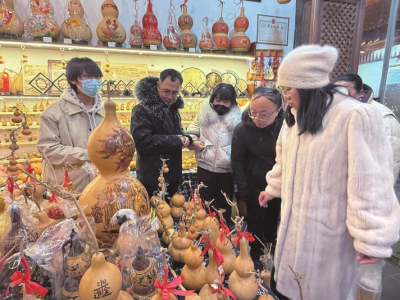 葫蘆烙畫吸引眼球。本報(bào)記者高瑋攝 祥蛇納福至,新歲瑞光盈。忻州古城張燈結(jié)彩,大年初一,許多游客走進(jìn)古城,沉浸式感受非遺的獨(dú)特魅力。 在吆喝聲此起彼伏的年貨市集,醒獅帽、剪紙、提燈等頗具年味的商品擺滿攤位,讓游客目不暇接,尤其是精美的葫蘆烙畫、面塑、扎染等非遺,既有傳統(tǒng)文化的風(fēng)韻,又融入現(xiàn)代設(shè)計(jì)巧思。 鐵板為紙、長(zhǎng)勺為筆、糖漿如墨,在非遺代表性傳承人張師傅的巧手下,琥珀色的糖漿流瀉而下,提腕、重點(diǎn)、拖尾……一系列動(dòng)作行云流水,幾個(gè)來回后,一幅精美的糖畫便躍然眼前。張師傅說:“糖畫是很多人的兒時(shí)回憶,也是過年的儀式感。我會(huì)把糖畫的手藝和甜蜜的年味年復(fù)一年地傳遞下去?!?/p> 身著鮮艷服飾,雙手緊握鼓槌的鑼鼓隊(duì)員們一記有力的重槌落下,瞬間吸引所有人的注意力。厚重密集的鼓點(diǎn)如驚雷滾滾,與清脆的銅鑼聲交織,活力四射地慶祝著新春。除了鑼鼓,跑驢兒、原平鳳秧歌、繁峙漁翁逗海蚌、定襄高蹺秧歌……各類特色表演接連上演,市民游客紛紛駐足觀看,陣陣叫好。 忻州古城相關(guān)負(fù)責(zé)人張如亭表示,春節(jié)期間,古城將舉辦多場(chǎng)非遺表演,除了山西本地非遺,還有陜西橫山腰鼓、侗族多耶舞、桂南采茶戲等,眾多精彩節(jié)目齊聚,營(yíng)造了濃厚熱烈的新春氛圍。 夜幕降臨,盞盞造型各異的花燈點(diǎn)亮古城,流光溢彩。為了給游客帶來更加豐富的節(jié)日體驗(yàn),忻州古城精心籌備了一系列花燈展覽,打造出一個(gè)年味濃郁的秀容城。蛇造型的花燈自然是燈展的“c位”,不少游客在蛇燈前拍照打卡,想討個(gè)新年的好彩頭。 忻州古城用一場(chǎng)場(chǎng)文化盛宴,讓游客不僅品嘗到美食、欣賞到美景,深入領(lǐng)略中華優(yōu)秀傳統(tǒng)文化的博大精深,也讓這個(gè)蛇年春節(jié)更加難忘。 本報(bào)記者高瑋 (責(zé)任編輯:盧相汀) |