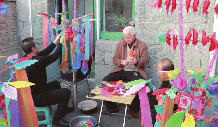 記者在現(xiàn)場(chǎng)看到,制作好的炮燈上有飄帶、繡球等裝飾,每盞炮燈不盡相同,畫(huà)有禾苗、動(dòng)物等不同圖案,寓意五谷豐登、六畜興旺,“孔雀展翅”“雄羊抵頭”“駿馬奔馳”等主題的炮燈活靈活現(xiàn)?!霸谖业挠洃浝铮覀兇迥昴甓加兄谱魇止づ跓舻膫鹘y(tǒng),保存好的炮燈能用上兩年,燈架能代代相傳,我們有義務(wù)將這種技藝傳承發(fā)揚(yáng)下去……”67歲的村民翟慶如是村里制作炮燈的“行家”,他現(xiàn)場(chǎng)拿起一張彩紙給記者折起了炮燈上的裝飾。