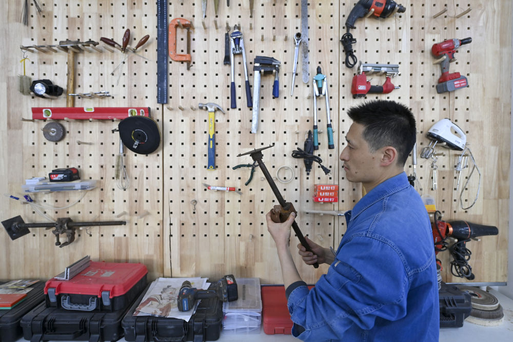 4月15日,在云岡研究院壁畫文物修復室,工作人員戴宇翔在挑選修復工具。