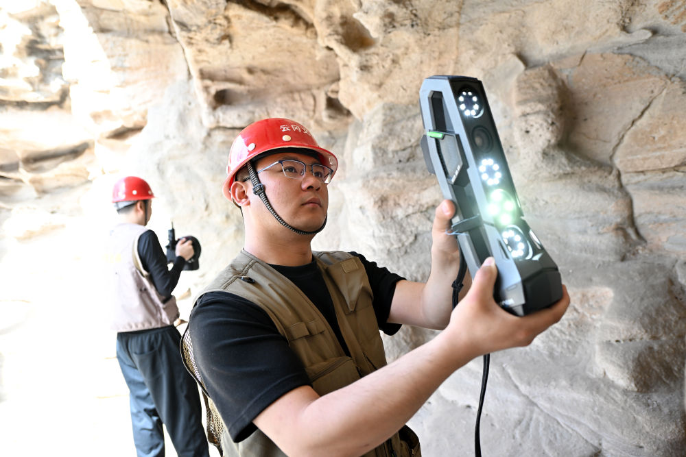 4月16日,在云岡石窟,云岡研究院數(shù)字化保護中心工作人員潘博(右)在進行數(shù)字化信息采集。隨著“數(shù)字檔案”不斷完善
