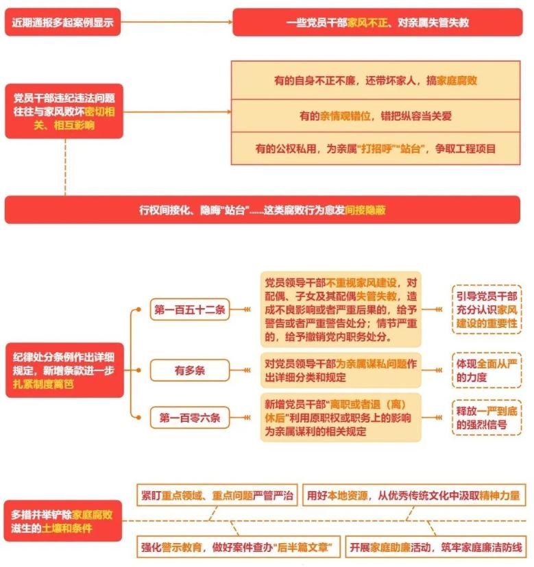 新修訂的《中國共產(chǎn)黨紀(jì)律處分條例》第一百五十二條對黨員領(lǐng)導(dǎo)干部“不重視家風(fēng)建設(shè),對配偶、子女及其配偶失管失教,造成不良影響或者嚴(yán)重后果”的情況作出規(guī)定,引導(dǎo)黨員干部充分認(rèn)識家風(fēng)建設(shè)的重要性。