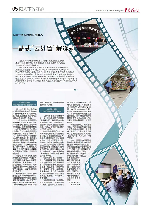 走進(jìn)忻州市涉案財(cái)物管理中心,“貴重、干燥、防磁、超規(guī)物品庫(kù)房”等標(biāo)識(shí)清晰可見,庫(kù)房?jī)?nèi)儲(chǔ)物箱分類編號(hào)、整齊排列,實(shí)現(xiàn)了涉案財(cái)物“倉(cāng)儲(chǔ)化”精細(xì)管理。 一體化管理、換押式移交、規(guī)范化處置……為進(jìn)一步加強(qiáng)公安機(jī)關(guān)執(zhí)法規(guī)范化建設(shè),維護(hù)公民、法人和其他組織的合法權(quán)益,推進(jìn)公安機(jī)關(guān)涉案財(cái)物規(guī)范化管理。近年來,忻州市公安局在市委、市政府的大力支持下,主動(dòng)對(duì)接檢、法機(jī)關(guān),牽頭建成市級(jí)涉案財(cái)物管理中心,實(shí)現(xiàn)了信息化、無紙化、規(guī)范化、物聯(lián)化、智能化和可追溯化,有效避免了涉案財(cái)物在流轉(zhuǎn)過程中遺失、破損、變質(zhì)等風(fēng)險(xiǎn)。運(yùn)行以來,忻州市涉案財(cái)物管理中心管理、處置刑事、行政案件涉案財(cái)物“零差錯(cuò)”,實(shí)現(xiàn)辦案效率、執(zhí)法規(guī)范“兩提升”,執(zhí)法風(fēng)險(xiǎn)、行政成本“雙下降”。 實(shí)現(xiàn)規(guī)范管理 打造跨部門涉案財(cái)物管理中心 以往,涉案財(cái)物尤其是車輛,常常面臨露天存放、維護(hù)缺失、管理分散等困境,容易導(dǎo)致財(cái)產(chǎn)貶值甚至損毀,既影響司法公正,也損害當(dāng)事人權(quán)益。 “為了進(jìn)一步破解涉案財(cái)物保管分散、執(zhí)行依據(jù)不明、處置效率低等難題,我們?cè)谌÷氏葎?chuàng)新打造了案件涉案財(cái)物管理中心,打通了跨部門協(xié)同辦案的全流程節(jié)點(diǎn),全力提升涉案財(cái)物處置規(guī)范化、高效化、智能化水平。”據(jù)忻州市涉案財(cái)物管理中心負(fù)責(zé)人李鴻劍介紹,通過細(xì)化財(cái)物保管和移送規(guī)則,明確市、區(qū)檢察院、法院和公安局等相關(guān)部門的職能、財(cái)物移送操作規(guī)范,成功構(gòu)建了一個(gè)底數(shù)清、保管善、專業(yè)化的涉案財(cái)物保管平臺(tái),顯著降低了財(cái)物貶損風(fēng)險(xiǎn)和保管成本。 對(duì)于容易消耗、損毀、變質(zhì)的“易貶損類”財(cái)物如何處置?忻州市涉案財(cái)物管理中心設(shè)置了登記管理室、密集管理室、一般財(cái)物保管室、特殊保管室、大宗物品保管室和車庫(kù)保管區(qū)域,實(shí)現(xiàn)了涉案財(cái)物分類管理,特殊物品專業(yè)管理。 制度保障方面,忻州市公安局陸續(xù)出臺(tái)了《涉案財(cái)物管理規(guī)定》《涉案車輛管理規(guī)定》及《隨身財(cái)物保管規(guī)定》等制度文件,加強(qiáng)了對(duì)關(guān)鍵環(huán)節(jié)的約束,確保涉案財(cái)物從扣押到處置全過程有章可循、依法推進(jìn)。截至目前,中心已規(guī)范管理涉案財(cái)物720件。 突出科技賦能 為規(guī)范管理提供技術(shù)支撐 在忻州市涉案財(cái)物管理中心,每一件物品都擁有自己的“電子身份證”。通過掃碼每一件涉案財(cái)物對(duì)應(yīng)的二維碼,即可全程追蹤財(cái)物去向,全程回溯流轉(zhuǎn)軌跡,實(shí)現(xiàn)了涉案財(cái)物的全方位、可溯化監(jiān)管。 這一切,得益于忻州市公安局研發(fā)應(yīng)用的涉案財(cái)物管理信息平臺(tái)。平臺(tái)涵蓋視頻監(jiān)控、環(huán)境監(jiān)測(cè)、溫濕度監(jiān)測(cè)、防火監(jiān)測(cè)等功能,實(shí)現(xiàn)對(duì)涉案財(cái)物實(shí)時(shí)、全程錄入和管理。同時(shí)通過與執(zhí)法辦案系統(tǒng)關(guān)聯(lián)互通,物品數(shù)據(jù)由辦案環(huán)節(jié)源頭采集錄入,使用電子標(biāo)簽唯一綁定涉案財(cái)物,實(shí)現(xiàn)“一物一碼”,有效解決過去“情況獲取難、日常監(jiān)督難、責(zé)任落實(shí)難”等問題。 在忻州市涉案財(cái)物管理中心,記者看到管理人員通過手持機(jī)打開涉案財(cái)物管理信息平臺(tái),即可隨時(shí)查看涉案財(cái)物存放位置、物品信息、流程等情況,保管員也可通過手持機(jī)做到快速盤點(diǎn),自動(dòng)統(tǒng)計(jì)盤點(diǎn)結(jié)果,生成盤點(diǎn)報(bào)告,結(jié)合系統(tǒng)內(nèi)的統(tǒng)計(jì)分析功能,實(shí)現(xiàn)高效無差錯(cuò)管理。 “我們可隨時(shí)通過手持機(jī)線上對(duì)涉案財(cái)物出、入庫(kù)進(jìn)行預(yù)約,提升了我們的辦案、管理效率,也節(jié)約了大量的時(shí)間?!惫芾砣藛T告訴記者,平臺(tái)設(shè)置了24小時(shí)超期入庫(kù)風(fēng)險(xiǎn)預(yù)警,對(duì)超過24小時(shí)未入庫(kù)的、涉案財(cái)物處理程序已流轉(zhuǎn)完畢可出庫(kù)的、物品臨時(shí)出庫(kù)超期等數(shù)據(jù)自動(dòng)推送。同時(shí),通過涉案財(cái)物管理信息平臺(tái),檢、法機(jī)關(guān)可對(duì)涉案物品無接觸調(diào)用,實(shí)現(xiàn)遠(yuǎn)程視證。 優(yōu)化鑒定模式、提升運(yùn)行效能。忻州市公安局通過專業(yè)化服務(wù)和規(guī)范化管理,讓數(shù)據(jù)多“跑腿”,辦案效率明顯提升,實(shí)現(xiàn)物證鑒定從原來的“至少跑兩趟”到如今的“一趟不用跑”。 如今,涉案財(cái)物在涉案財(cái)物管理中心集中保管后,在案件偵查、起訴、審判和執(zhí)行的過程中,涉案物品信息通過“信息平臺(tái)”在公安、檢察、法院之間隨案流轉(zhuǎn)。只需在線上按