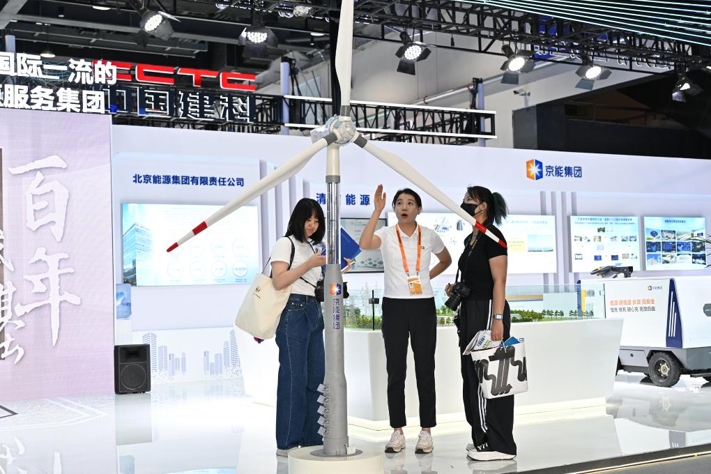 參觀者在服貿(mào)會(huì)首鋼園區(qū)京能集團(tuán)展臺(tái)觀看一款新型風(fēng)機(jī)模型。新華社記者 李鑫 攝