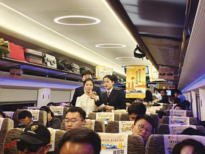 4月22日一早,在太原開(kāi)往北京的書香列車上,山西晚報(bào)記者看到了這樣一幕。車廂內(nèi),兩側(cè)車窗、行李架、衛(wèi)生間、洗漱臺(tái)等處張貼全民閱讀大會(huì)標(biāo)識(shí),營(yíng)造了濃厚的活動(dòng)氛圍。列車視頻和廣播循環(huán)播放全民閱讀大會(huì)宣傳片,介紹大會(huì)概況及“書香列車”情況。幾名年輕乘客圍在列車餐吧臺(tái)增設(shè)的“讀書角”,選取自己喜歡的讀物。列車工作人員利用流動(dòng)小車,送書到車廂,為旅客提供圖書借閱服務(wù)。在車廂兩端、每個(gè)座位頭枕巾上張貼、印刷全民閱讀大會(huì)主題海報(bào)和“書香列車云閱讀”二維碼,不少旅客掃碼開(kāi)始免費(fèi)聽(tīng)書、看書。