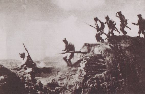 圖12 1938年春,晉西北抗日根據(jù)地軍民打退日軍的五路圍攻,收復(fù)寧武、神池等7座縣城。圖為部隊在收復(fù)寧武縣城戰(zhàn)斗中。