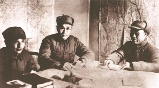 圖9 1937年12月,八路軍第一二九師開辟以太行山為中心的晉冀豫抗日根據(jù)地。圖為朱德(右)與劉伯承(中)、鄧小平(左)在研究根據(jù)地建設(shè)。