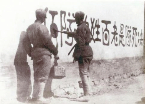 圖2 山西新軍既是戰(zhàn)斗隊,又是工作隊。他們走到哪里,宣傳到哪里,動員青年參軍;組織人民武裝自衛(wèi)隊、游擊隊;協(xié)助地方建黨、建政,組建工、農(nóng)、青、婦等群眾團(tuán)體,創(chuàng)建抗日根據(jù)地。圖為1938年初,決死隊?wèi)?zhàn)士在沁縣書寫宣傳標(biāo)語。